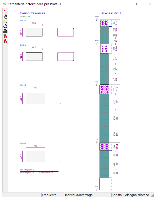 Questo Foglio consente di visualizzare ed editare le caratteristiche degli elementi di rinforzo della pilastrata. Viene visualizzata la geometria della pilastrata con la disposizione dettagliata degli elementi di rinforzo, sulla luce dei pilastri e nei nodi, nonché le sezioni di ciascun pilastro al piano e le varie quotature di dettaglio.