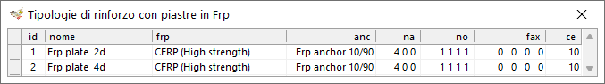 Il foglio si apre scegliendo la voce di menù Dati|Tipi Rinforzi|Piastre in m.composito.