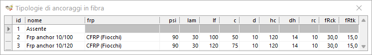 Il foglio si apre scegliendo la voce di menù Dati|Tipi Rinforzi|Ancoraggi in m.composito.