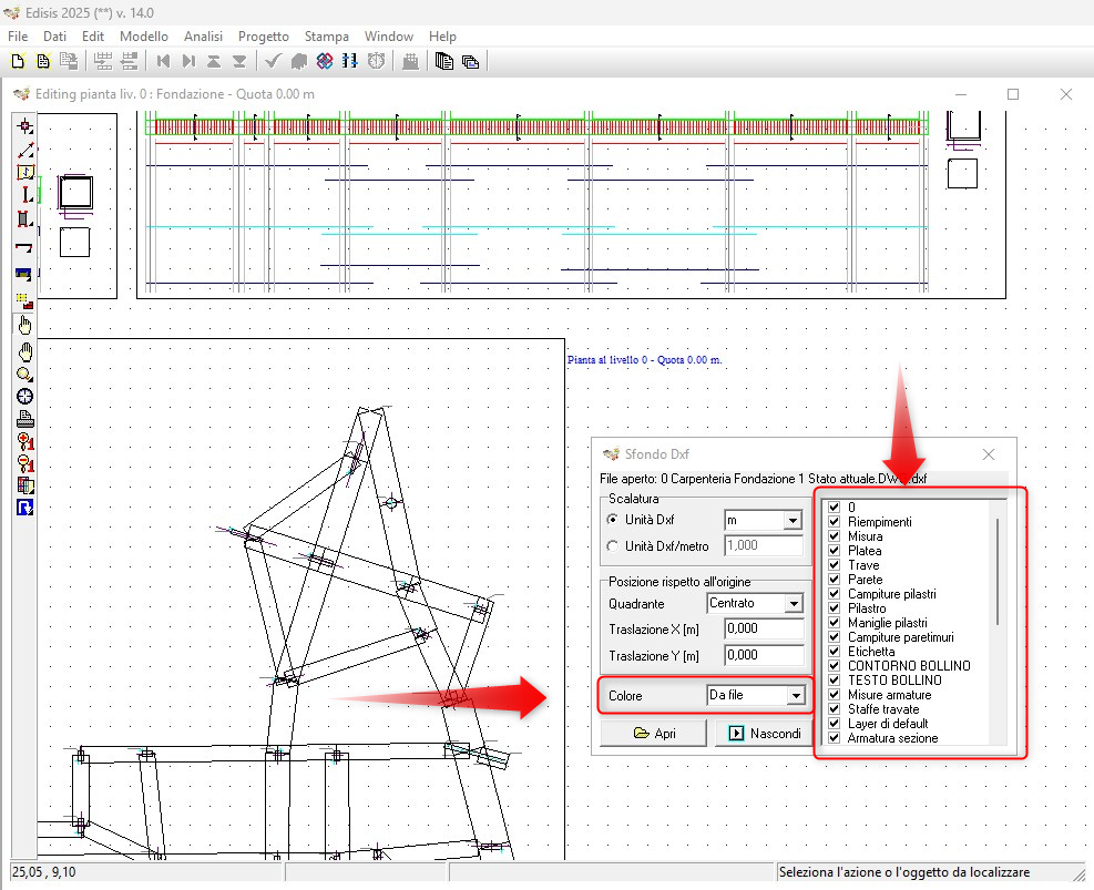 Nella fase di input del modello, un grosso aiuto viene dalla possibilità di importare uno sfondo grafico sul quale eseguire le operazioni d’inserimento in pianta. Con la nuova versione sono state ampliate le capacità di importazione degli sfondi Dxf (che non richiedono più preparazioni preliminari) ed è stata aggiunta la capacità di lettura di file Dwg, con la possibilità di importare tutti gli elementi del disegno (linee, polilinee, caratteri, ecc.), accendere o spegnere singoli layers, gestire lo snap e visualizzare i colori originali oppure uniformarli ad un unico colore.
