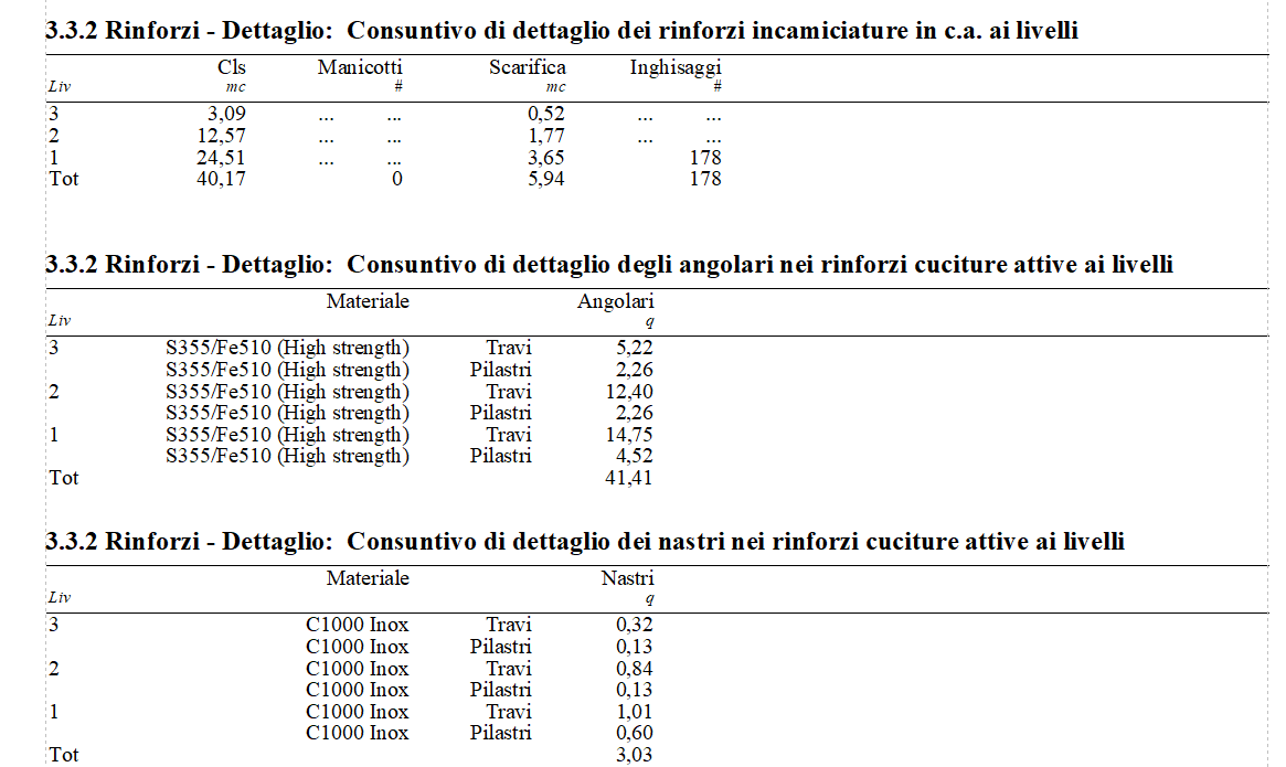 Il consuntivo dei materiali è stato esteso ai rinforzi, per tutti i tipi previsti dal programma ed è dettagliato per tipologie, livelli etc. in modo da poter avere sempre un controlli immediati dei quantitativi globali per stime accurate dei costi nelle fasi successive delle lavorazioni.