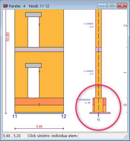 Ad esempio, assegnando opportunamente i ringrossi a sinistra e a destra è possibile rinforzare l’elemento di fondazione allargando l’anima e trasformando la sezione a T rovescio in sezione rettangolare, applicando in questo caso un affiancamento di materiale simile alla fondazione preesistente.