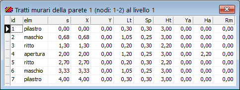 - Sono riportate le caratteristiche dei tratti presenti sulla parete ad un determinato piano. I tratti corrispondono ai vuoti e ai pieni determinati dalla presenza delle aperture sui pannelli, ma includono anche gli elenti originati dalla presenza di pilastri nodali e di ritti di cerchiatura..