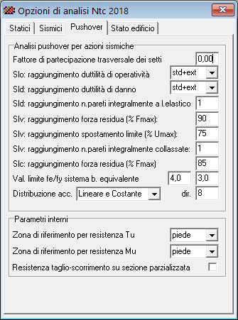- impostazione standard (std): è quella strettamente richiesta dalle Ntc08 e Ntc18, in cui la condizione di raggiungimento dello stato limite dipende dal valore limite di duttilità dd impostato nei tipi di muratura per Sld in base ai limiti regolamentari dello spostamento d'interpiano: