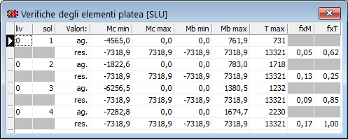 Con l'analisi locale delle platee e del graticcio nella sua interezza vengono determinate le tensioni sul terreno a centro platea e lungo i bordi (condivise queste con le fondazioni murarie), nonchè le sollecitazioni strutturali a flessione e taglio per le zone centrali e di bordo delle platee: Le verifiche sono condotte agli Slu, valutando momenti e tagli resistenti in base alle caratteristiche meccaniche del calcestruzzo ed alle armature disposte nella platea.