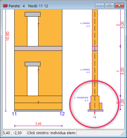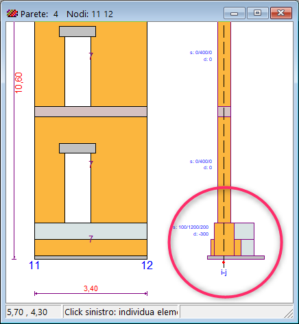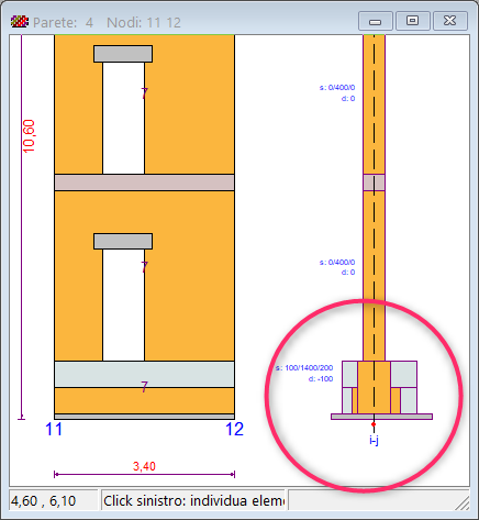 Ad esempio, assegnando opportunamente i ringrossi a sinistra e a destra è possibile rinforzare l’elemento di fondazione allargando l’anima e trasformando la sezione a T rovescio in sezione rettangolare, applicando in questo caso un affiancamento di materiale simile alla fondazione preesistente.