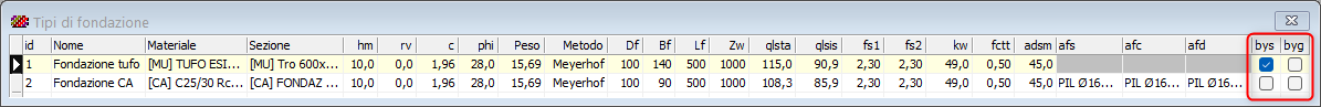 Questa operazione si esegue nella griglia dei Tipi di fondazioni, nella quale sono state aggiunte le due colonne:
